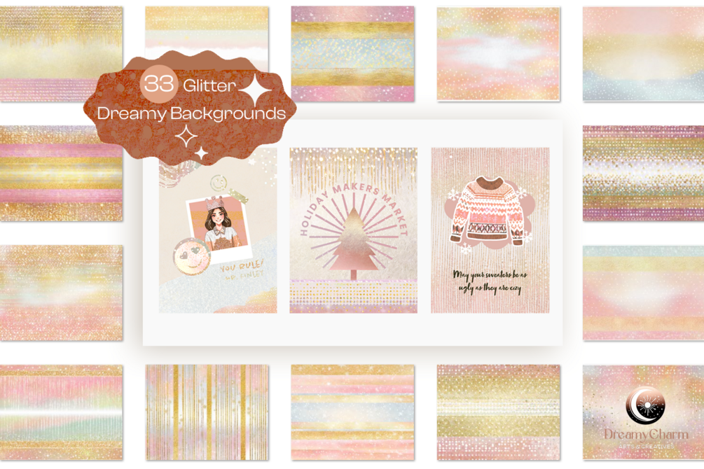 33 PNG high-quality backgrounds, each with its unique blend of sparkle and color. Bonus: This pack includes a set of mock-ups to inspire your designs and showcase the potential applications of these backgrounds.