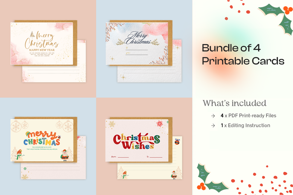 Perfect for those who appreciate the blend of traditional festive designs with a personal twist, our Christmas Card Pack is set to make your holiday greetings stand out. Embrace the spirit of the season and leave a memorable impression with these brightly hued, editable Christmas cards! 🎄💖✨